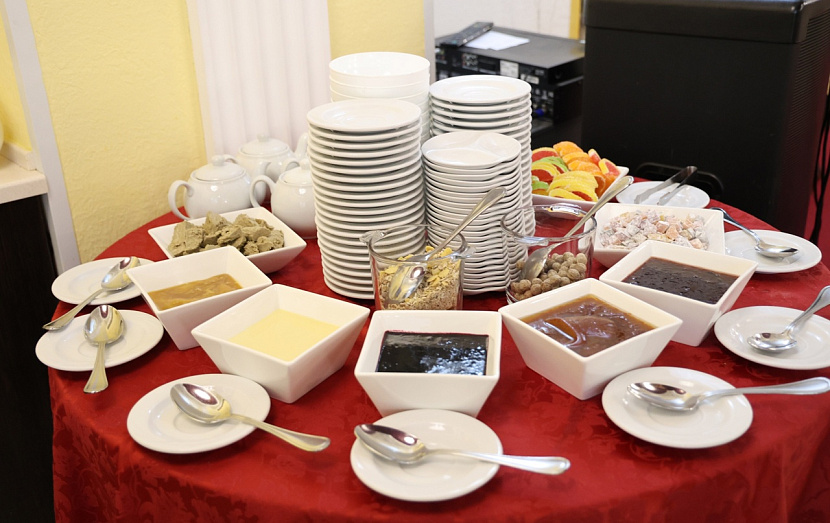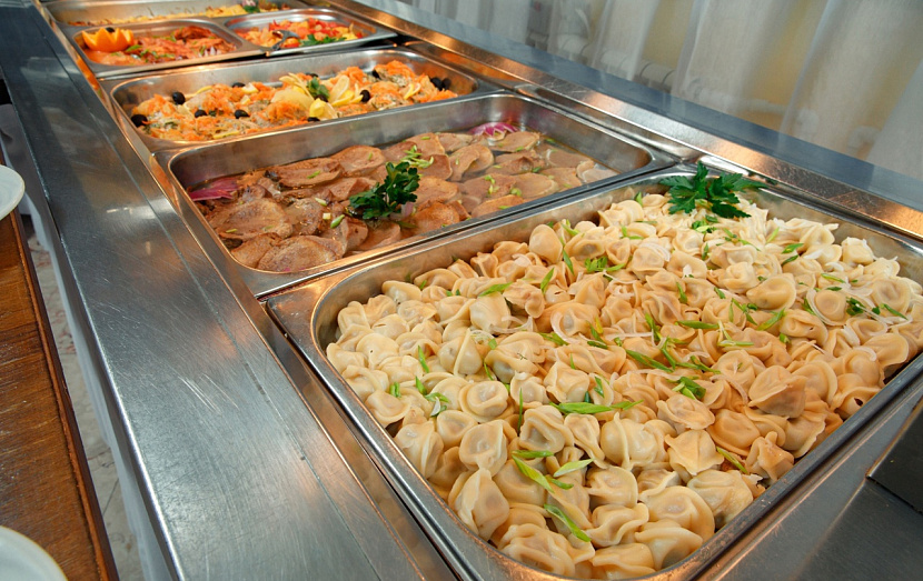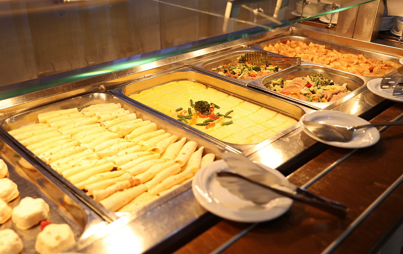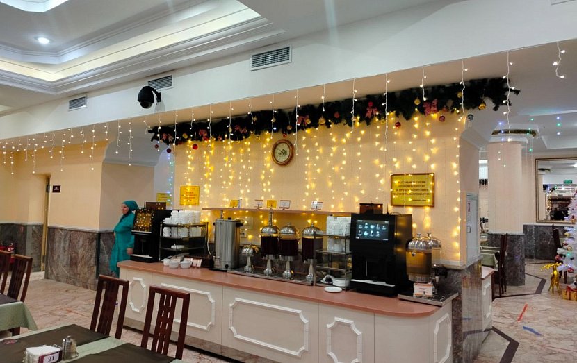 В стоимость проживания включено 3-разовое питание по системе «шведский стол». Обеденные залы расположены в Центре досуга, корпусе №6 и в отдельно стоящем здании между корпусами №№4 и 5. По пятницам в залах питания организована дегустация национальных блюд. Дополнительно работают: ресторан европейского типа «Урал» с живой музыкой и разнообразной кухней, кафе горнолыжного комплекса и бар второго корпуса, фитобары.